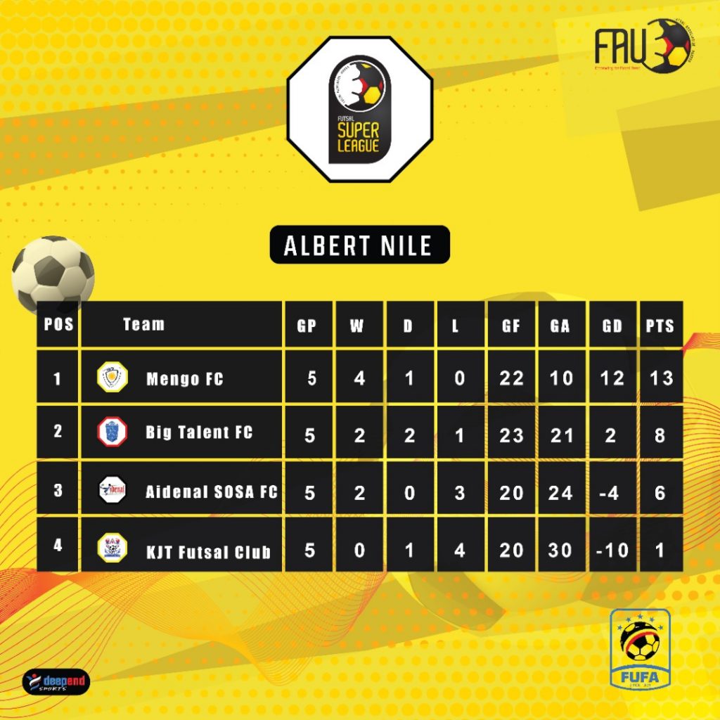 Aidenal SOSA will qualify for the semi finals of the 2021 Futsal Super League should they defeat bottom placed Kampala Junior Team provided Big Talent get anything less of a draw against unbeaten Mengo Futsal Club.